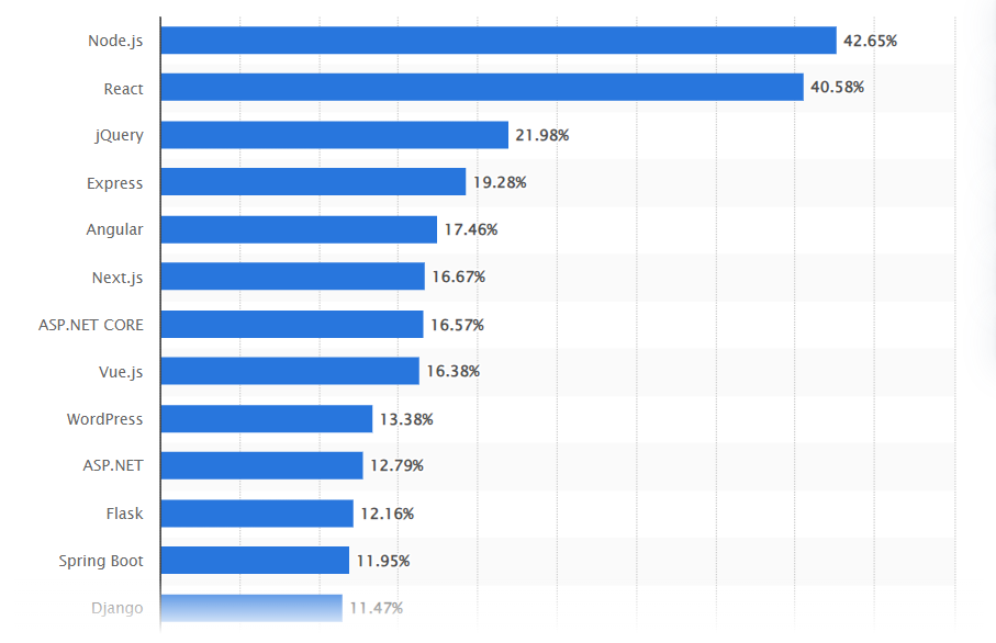 Its event-driven architecture and vast ecosystem have attracted developers and businesses, contributing to its widespread adoption. According to Statista, 36.42% of developers prefer to use Node.js frameworks, tools, libraries, and IDEs for app development.