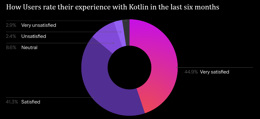 Kotlin’s Satisfaction rate by users is 86% based on the survey report by JetBrains.